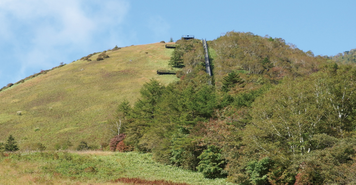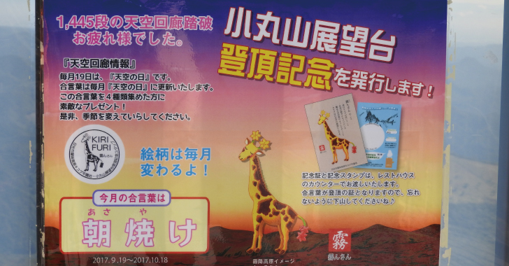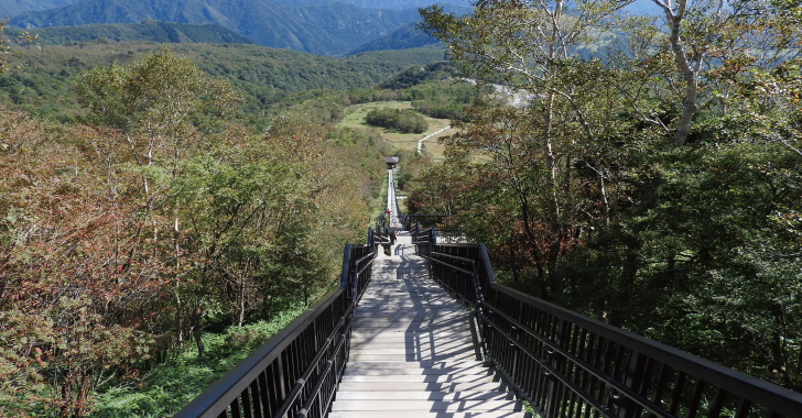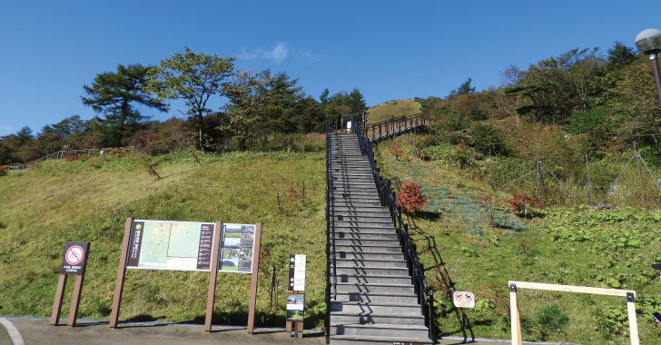 霧降高原バス停のすぐ横が小丸山展望台へ向かう天空回廊になってます。”天空回廊”って名前の響きはものすごくいいのですが、ここから体力との勝負のスタートです。