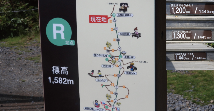 歩くこと15分。やっとの思いでR地点、小丸山展望台へ到着しました。もう膝がガクガクしてますが、その横を登山する方が平然と通り過ぎていきました。