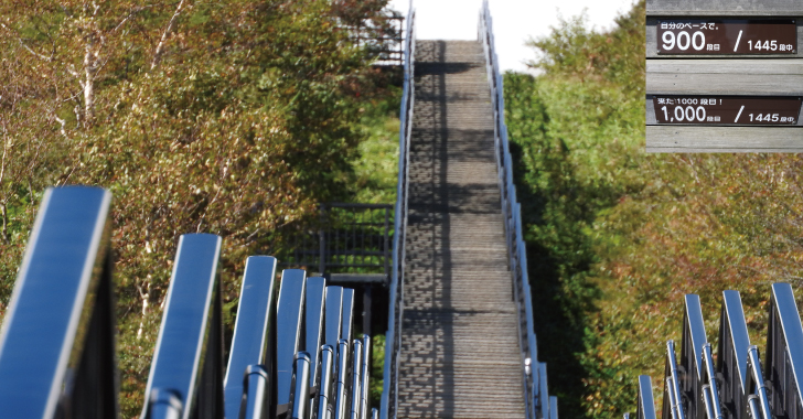 ここから小丸山展望台まで階段1445段。最初から階段は大変なので、天空回廊の中間地点らしき「N」地点までは遠回りになりますが、なだらかな散策路を歩いた方が歩きやすいですよ。